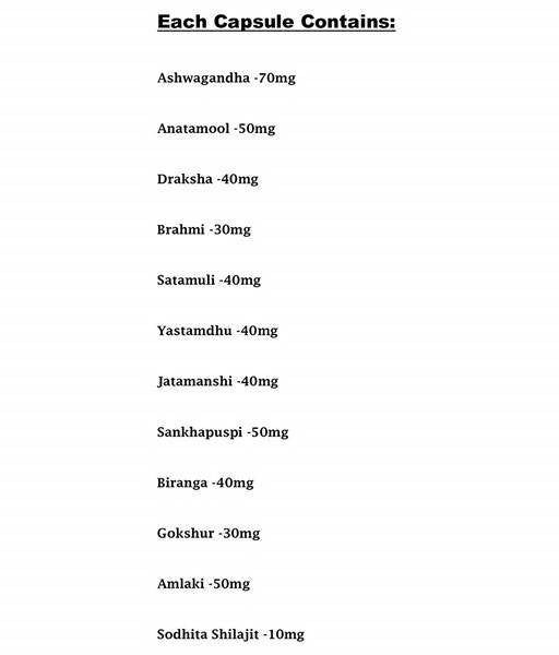 Ashwagandha, Anantamul, Draksa, Brahmi, Satamuli, Jastimadhu, Jatamanshi, Sankhpushpi, Viranga, Gokhur, Amlaki