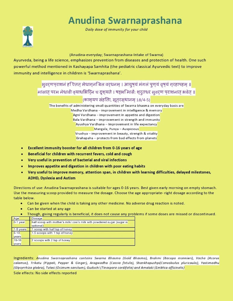 - Swarna Bhasma, Brahmi, Vacha, Trikatu (Pippali, Pepper & Ginger), Aragwadha, Shankhapushpi, Yastimadhu, Tulasi, Guduchi, and Amalaki.
