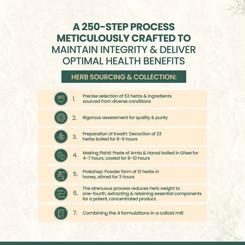 The key is a harmonic combination of over 50 potent herbs, including Amla, Ashwagandha, Shatavari, and Giloy