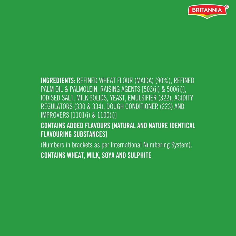 Prepared using Refined Wheat Flour (Maida), Refined Palm Oil & Palmolein, Raising Agents, Iodised Salt, Milk Solids, Yeast, Emulsifier, Acidity Regulators, Dough Conditioner And Improvers