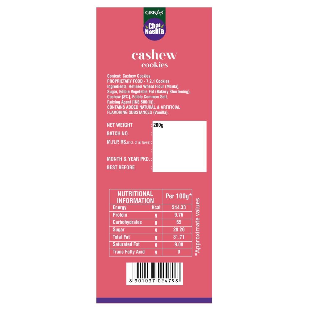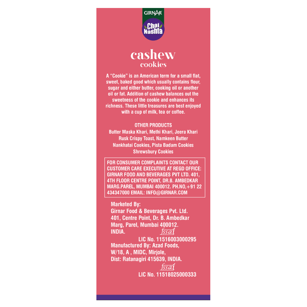 Ingredients: Refined Wheat Flour(45 %),Sugar, Edible Vegetable Fat, Cashew, Edible Common Salt, Raising Agent [INS 500(ii)], CONTAINS ADDED NATURAL & ARTIFICIAL FLAVOURING SUBSTANCES (Vanilla)