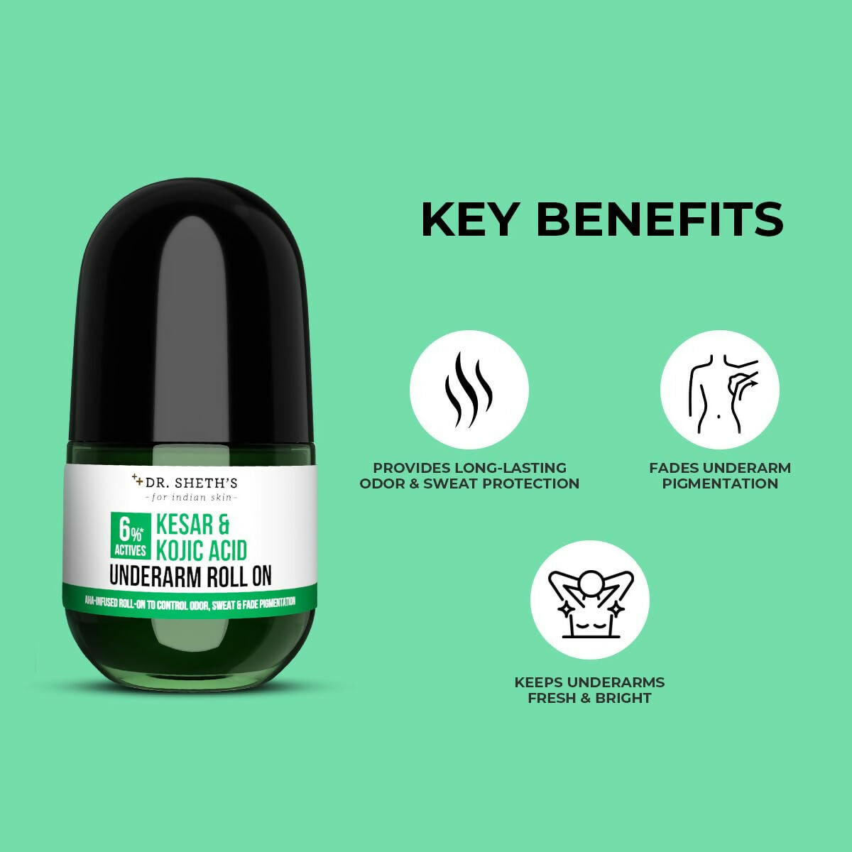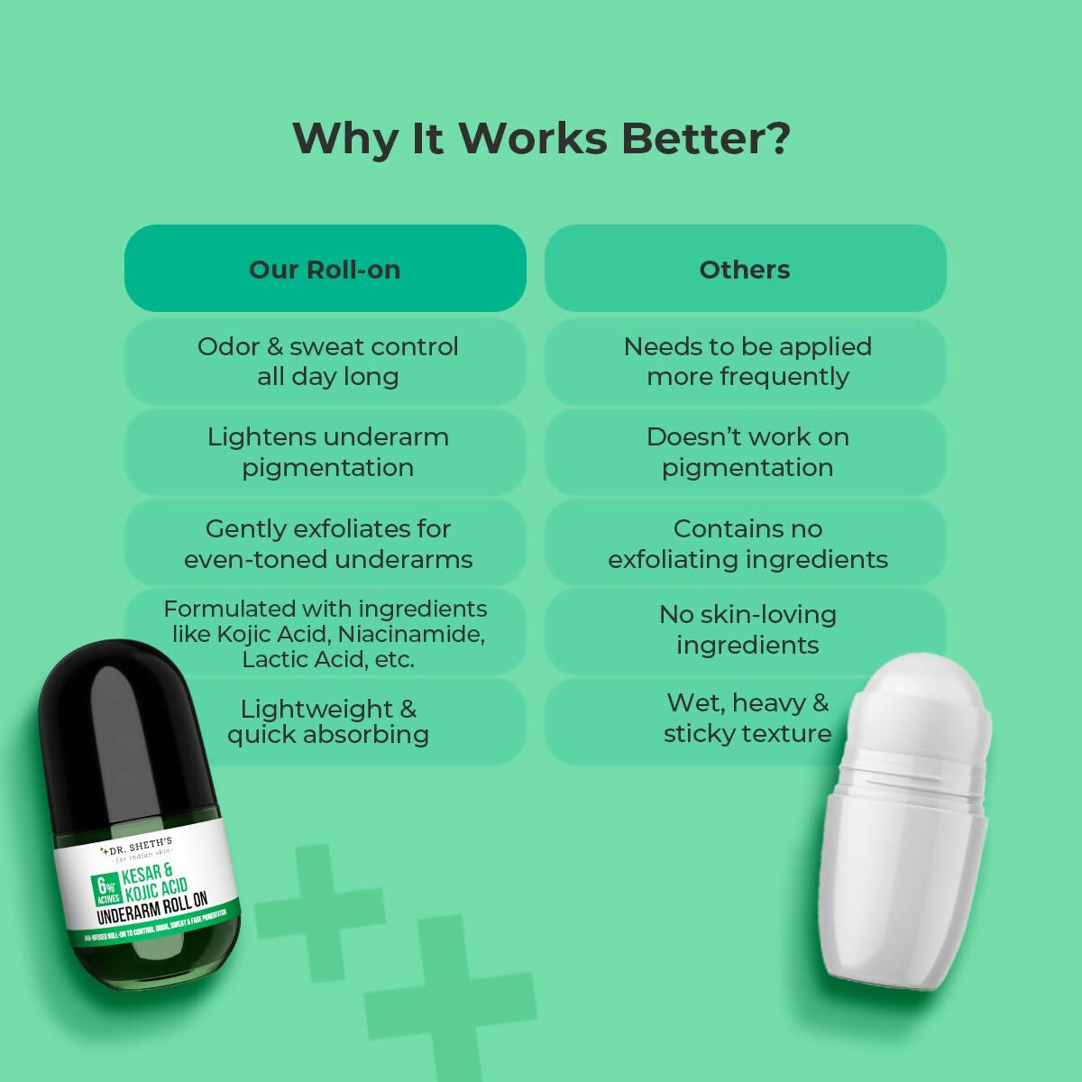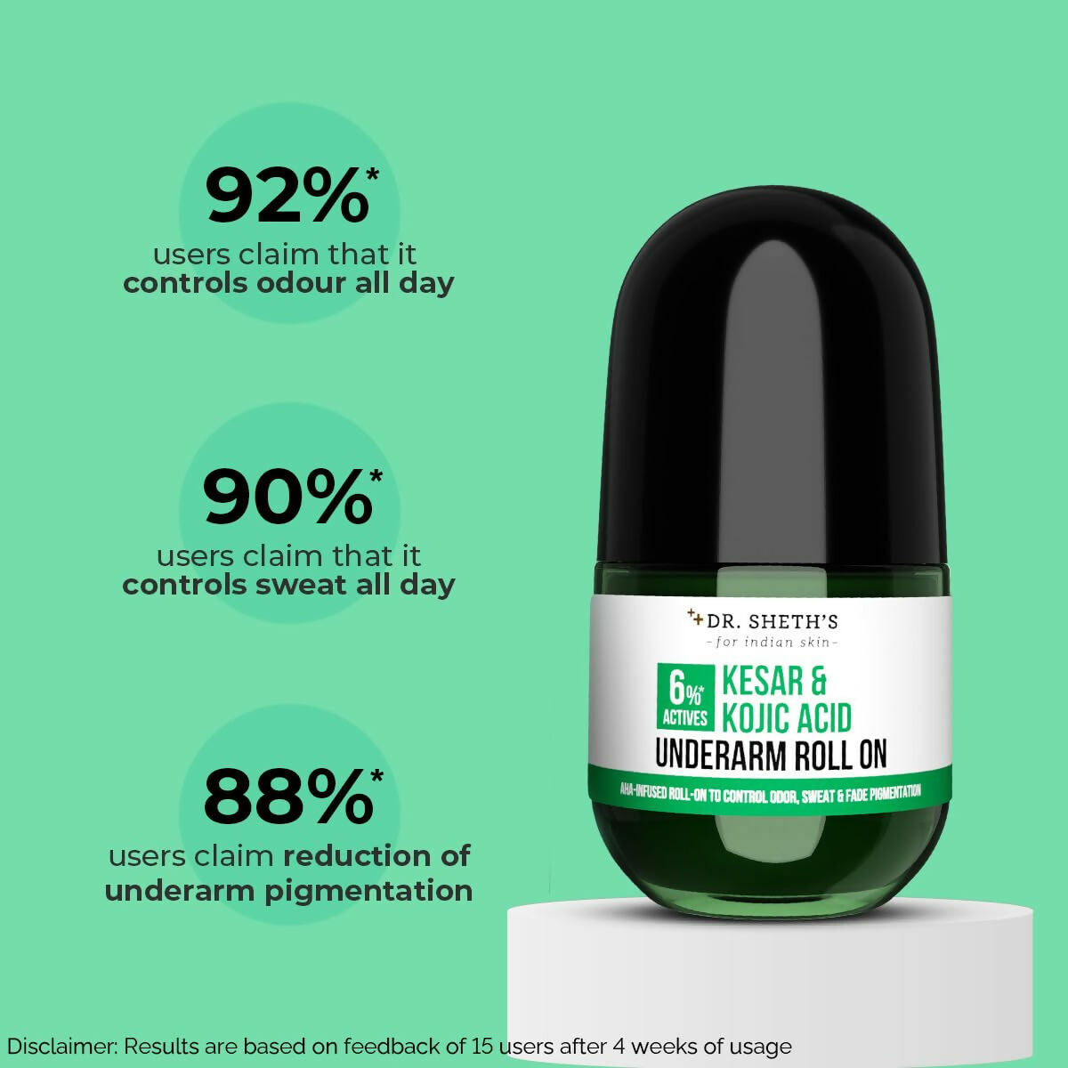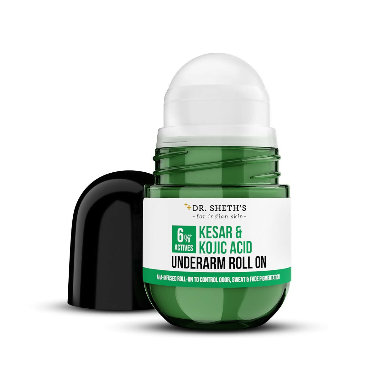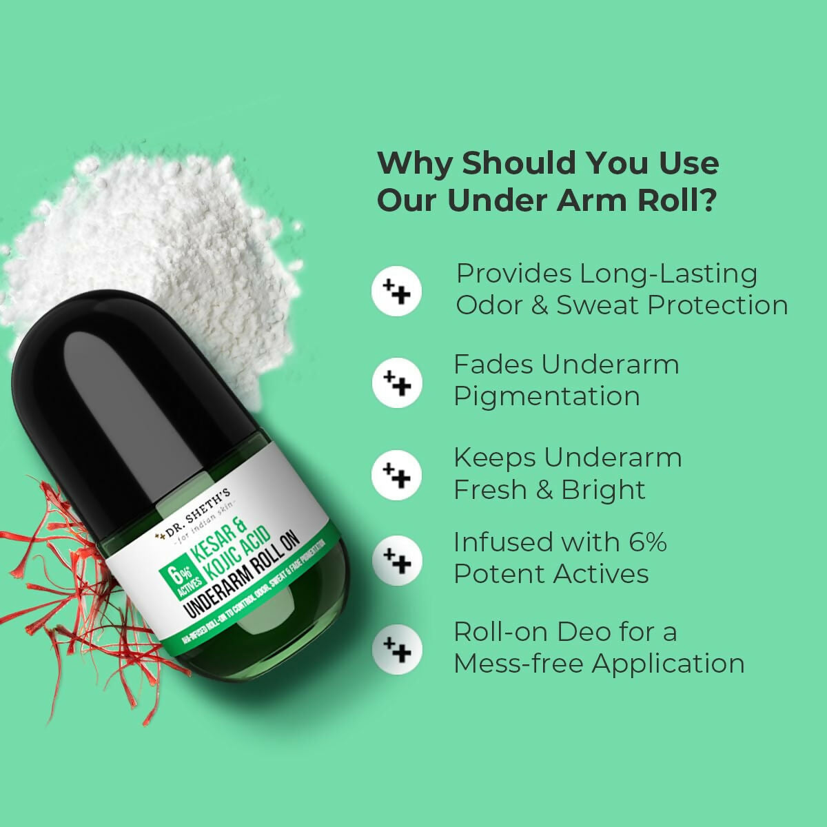 Dr. Sheth's Kesar & Kojic Acid Underarm Roll-on 6% Actives -AHA, Kojic Acid & Niacinamide, Controls Body Odor, Sweat & Fade Pigmentation