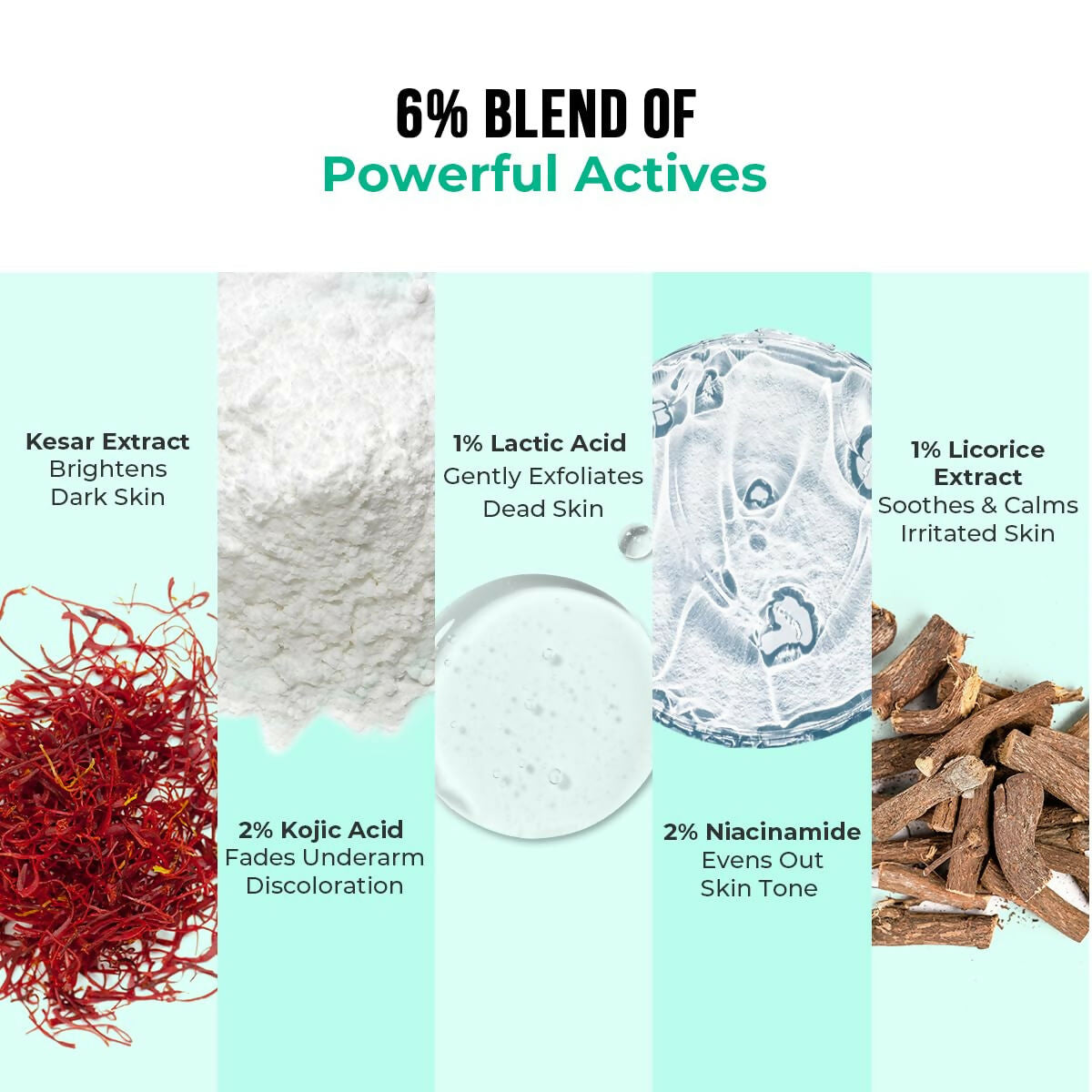 • SAFE & EFFECTIVE : Crafted by dermatologists, our underarm roll-on includes a powerful 6% blend of active ingredients like Kesar extract, Kojic Acid, Lactic Acid, Niacinamide, and Licorice extract. It is made with clean, effective components and is free from harmful chemicals such as Triclosan, Sulphates, Dyes, Parabens, and Aluminum. Plus, our products are cruelty-free, ensuring no animal testing is involved.