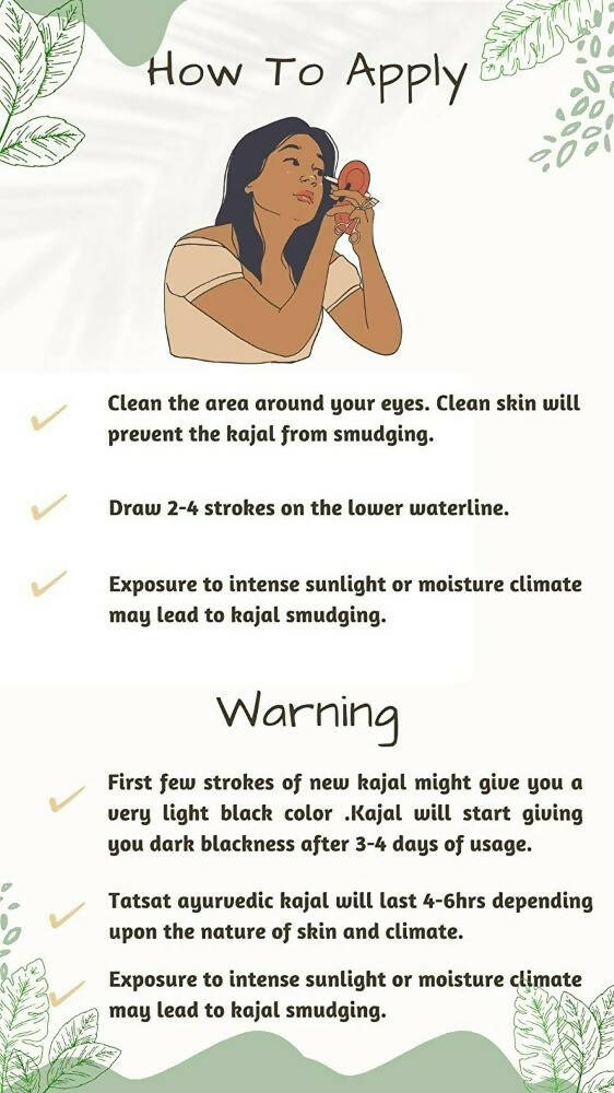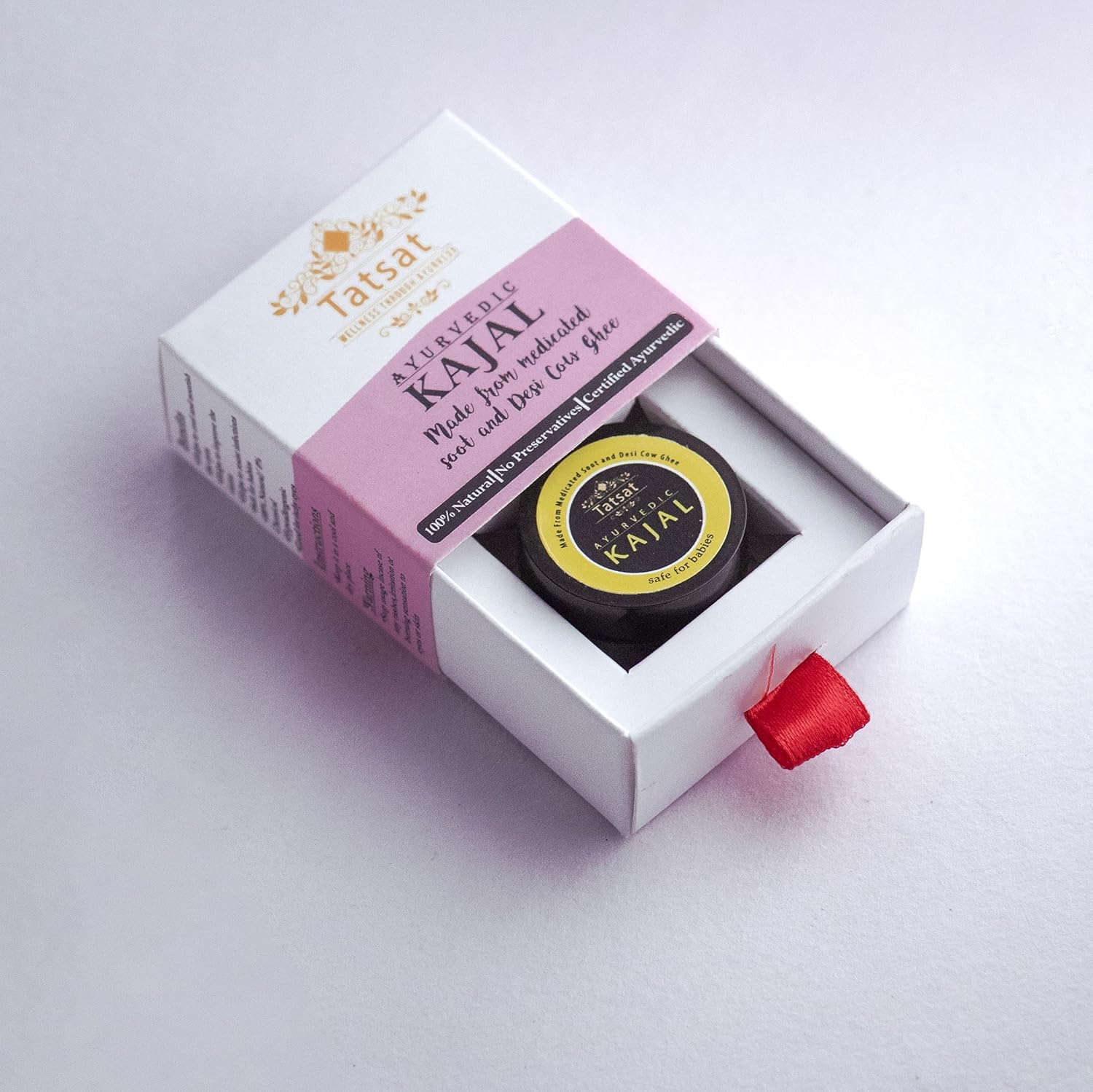 TATSAT Ayurvedic Kajal is an eye-soothing hand-made kajal made as per the 5000-year-old Kerala traditional process by an Ayurvedic expert. The chakshushya(nourishing the eyes) herbs Thriphala, daruharidra, sahadevi, and tulsi are processed for 21 days to get the maximum benefit. The medicated soot is made from these chakshushya herbs using the traditional castor oil/ghee lamp method. This medicated soot is the source of pure black color for our Kajal. TATSAT kajal is the best hypoallergenic kajal which can safely be used daily for all irrespective of age. Those kajal lovers looking for a clean natural look without having to worry about causing any irritation, allergic reactions, or damage to the eyes, This could be your best choice.
