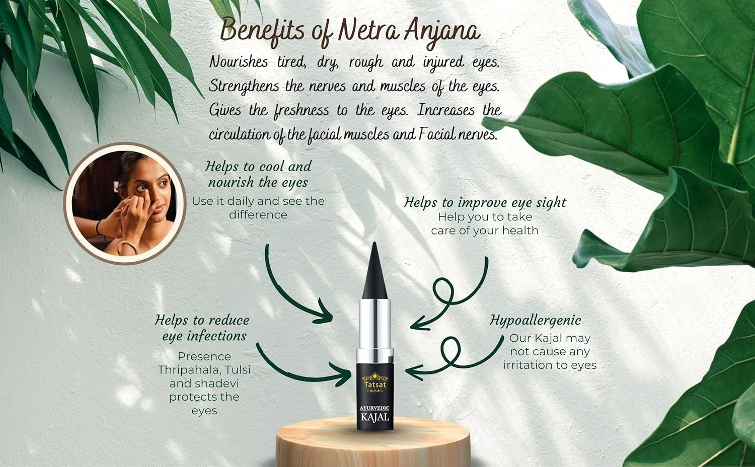 Tatsat Ayurvedic Kajal is an eye soothing hand made kajal made as per the 5000 year old kerala traditional process by an ayurvedic expert. The chakshushya(nourishing the eyes) herbs Thriphala,daruharidra,sahadevi, and tulsi are processed for 21 days to get the maximum benefit. The medicated soot is made from these chakshushyaherbs using the traditional castor oil/ghee lamp method. This medicated soot is the source of pure black color for our Kajal. Tatsat kajal is the best hypoallergenic kajal which can safely be used on a daily basis for all irrespective of their ages. Those kajal lovers looking for a clean natural look without having to worry about causing any irritation, allergic reactions or damage to the eyes, This could be your best choice. The dark lined eyes are unavoidable look for almost all women out there. This is the very simple way to feel and look beautiful hence it's important that we use a product that is completely safe and natural for our eyes. 3-5 times of Tatsat Kajal will give you that perfect black lining you wish and this could be your safe product for an entire 365 days of daily use.Color: Soot Black