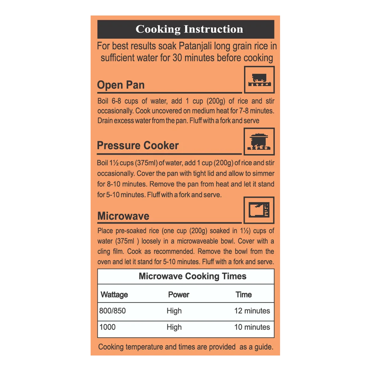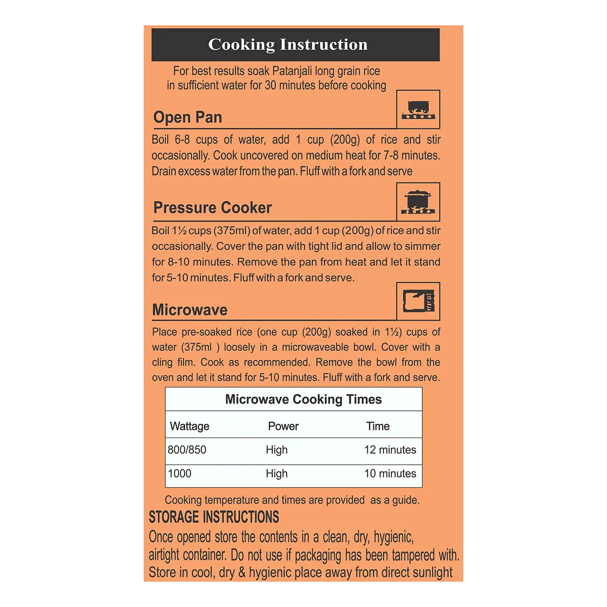 For best results soak Patanjali long grain rice in sufficient water for 30 minutes before cooking