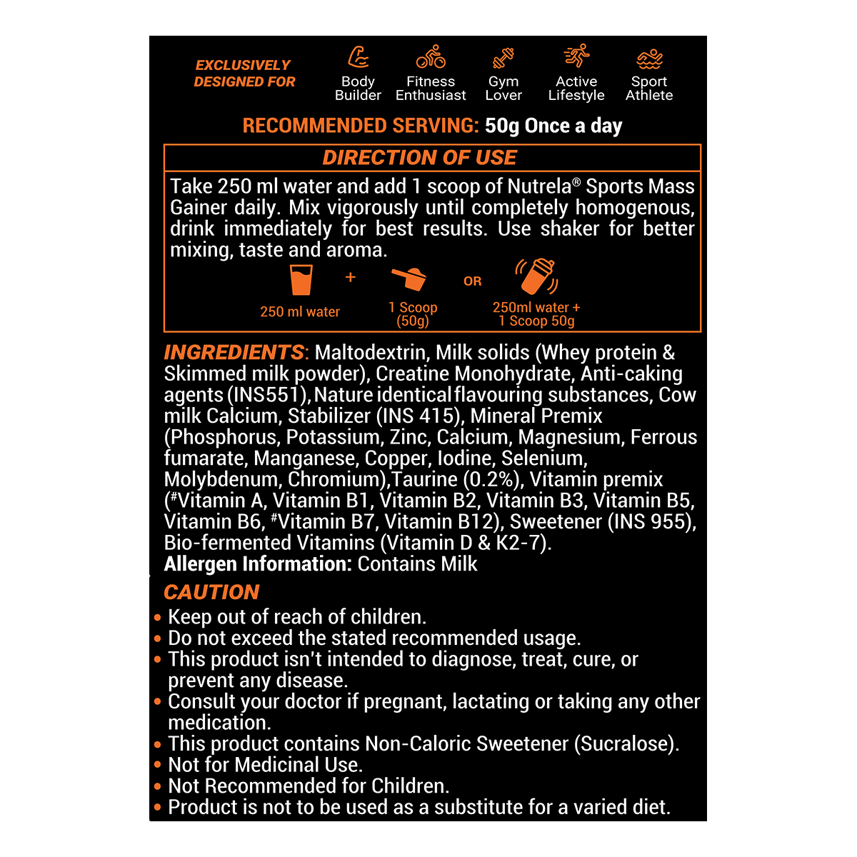 Take 250 ml water and add 1 scoop of Nutrela® Sports Mass Gainer daily. Mix vigorously until completely homogenous, drink immediately for best results. Use shaker for better mixing, taste and aroma.Safety Information