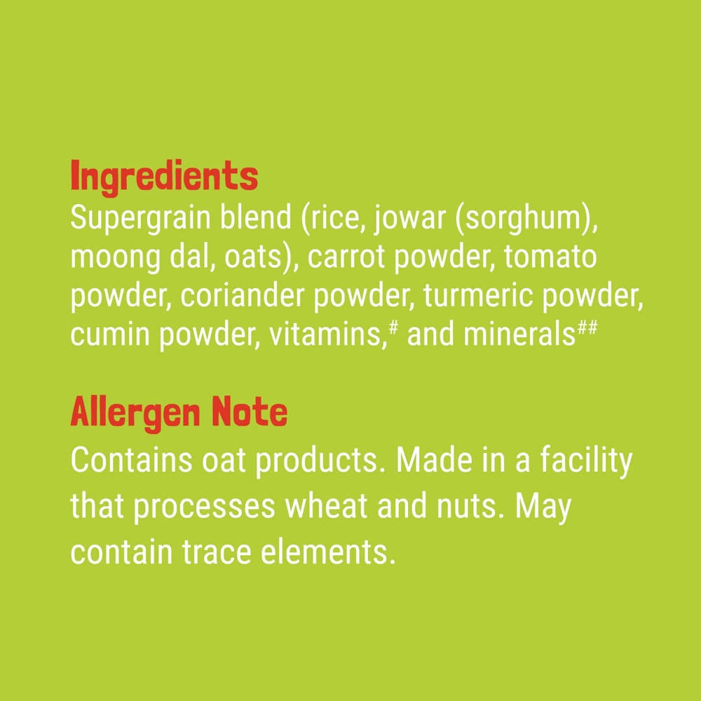 Supergrain blend [Rice, Jowar (Sorghum), Moong Dal, Oats], Tomato powder, Carrot powder, Turmeric powder, Cumin powder and Coriander powder, Vitamins and Minerals