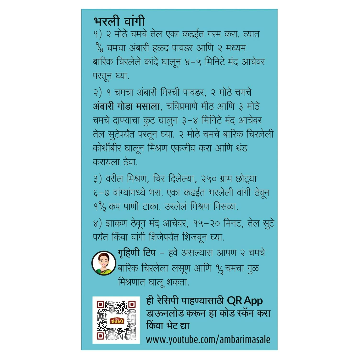 • Used for making Bharli Vangi (stuffed brinjals), masale bhaat, tondli bhaat (spiced ivy gourd rice), Dal Amti (Maharashtrian dal made from pigeon pea lentils), matki usal, bharli bhendi & katachi amti (gravy served with puran poli etc.)