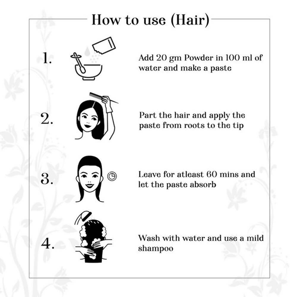 • Hair: Mix powder & water to form a paste. Apply the paste from root to tip for 6 mins. Rinse with water