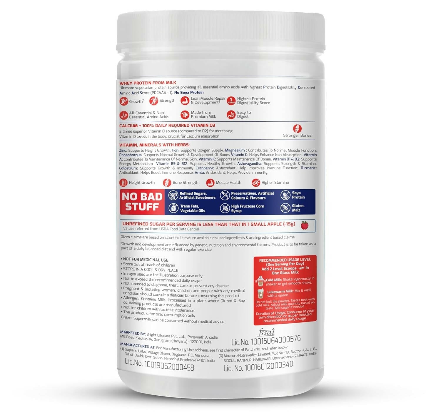 - Boost the natural process of increasing height with Gritzo SuperMilk Height+ for 13+ girls. It comes with 13 g of high-quality protein in each serving of 33.3 g and fills the daily protein gap. In addition, it is enriched with 100% RDA Vitamin D3 (3X more efficient than Vitamin D2), thus leading to better Calcium absorption in the body. It also has 21 Essential Vitamins + Minerals with Electrolytes to ensure overall health and growth.