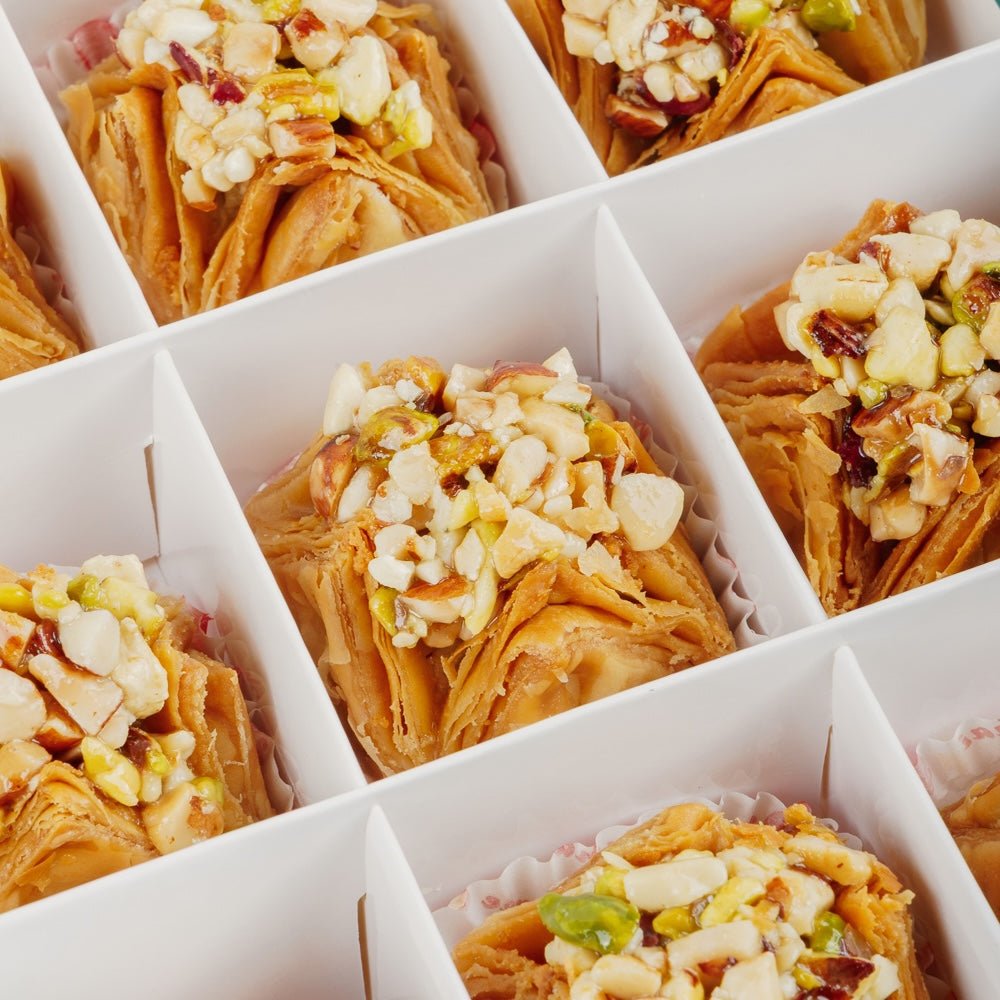Indulge in the exquisite flavors of our Mixed Dry Fruit Pyramid Baklava. Layers of flaky phyllo pastry are filled with a delectable mixture of assorted dry fruits and nuts, then drenched in fragrant sugar syrup, creating a sweet and crunchy treat that's perfect for any celebration or special occasion.