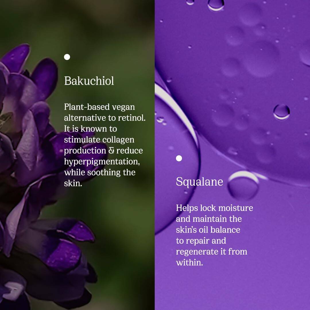 • Bakuchiol (bah.koo.chee.ole) is a plant-based derivative that is often called nature’s retinol. It helps to reduce the appearance of fine lines, improve skin’s elasticity, and restore its firmness. It is also known to refine skin texture and visibly improve skin tone.