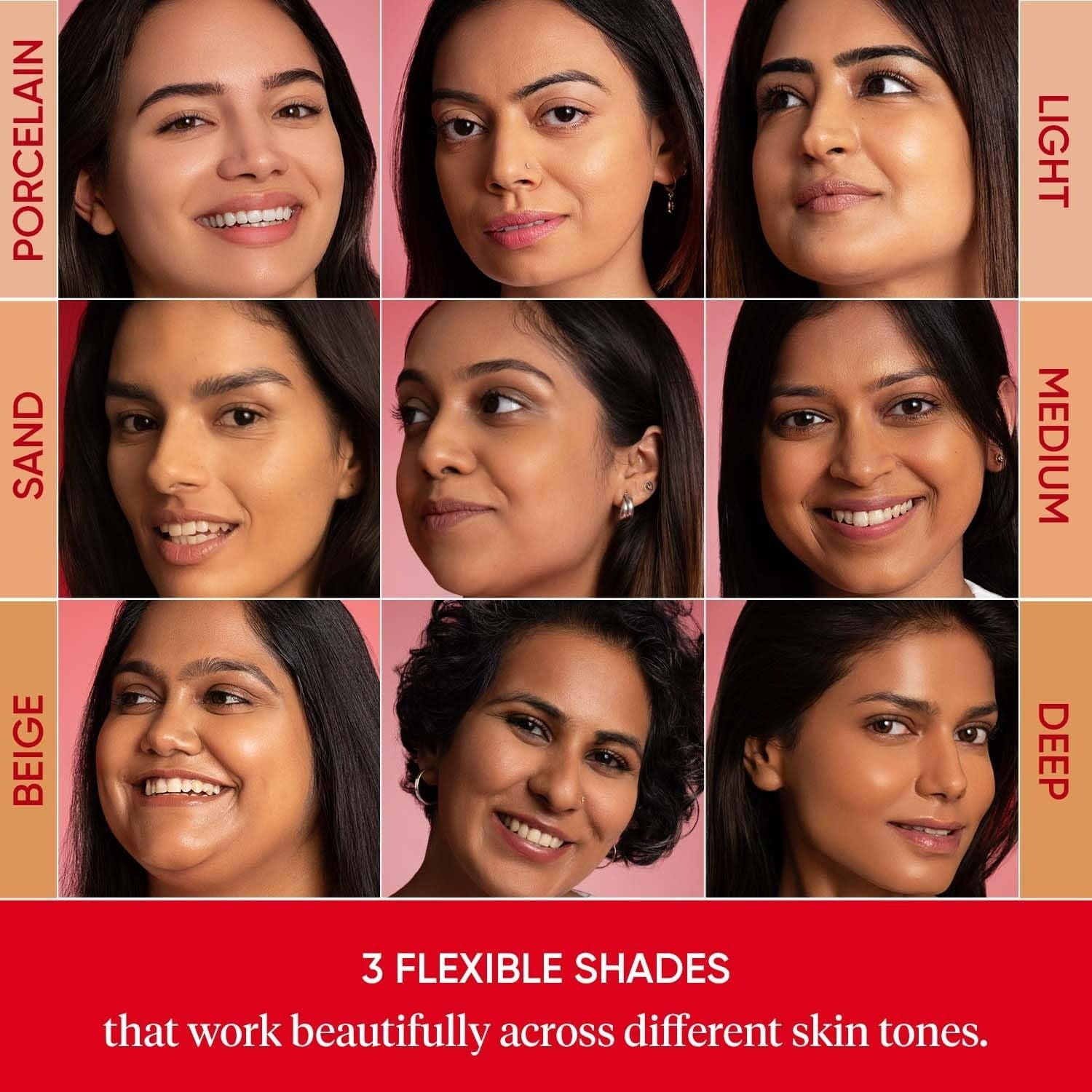 • Daily use tinted sunscreen available in 3 flexible shades. Infused with strawberry, niacinamide & UV filters, it features an ultra-light fluid texture that blends effortlessly to provide sheer coverage, a natural satin finish & high UVA+UVB+blue light protection. Suitable for all skin types, it leaves zero white cast, greasy or sticky after-feel.