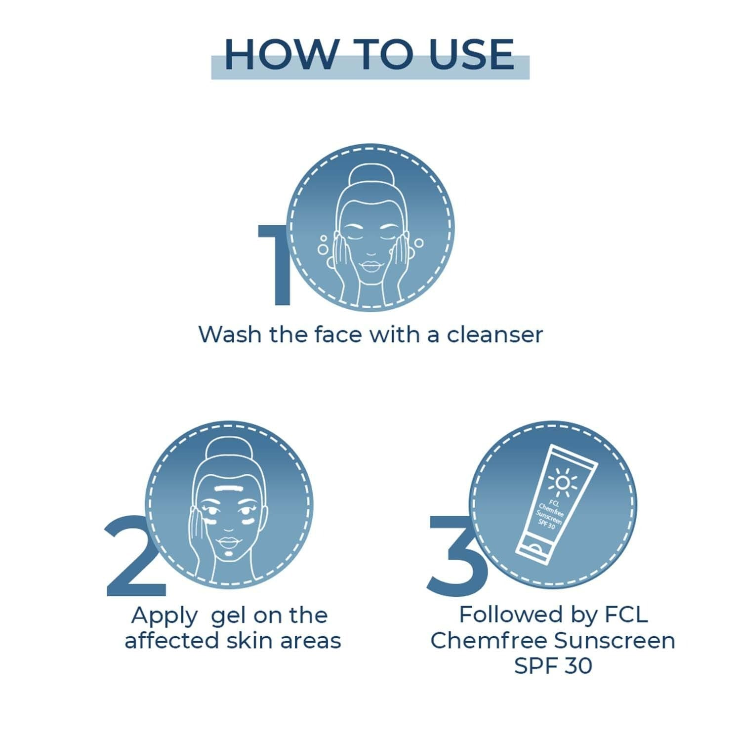 • Wash the face with a cleanser and apply sufficient quantity of gel on the affected skin areas, followed by FCL Chemfree Sunscreen SPF 30 in the day time.