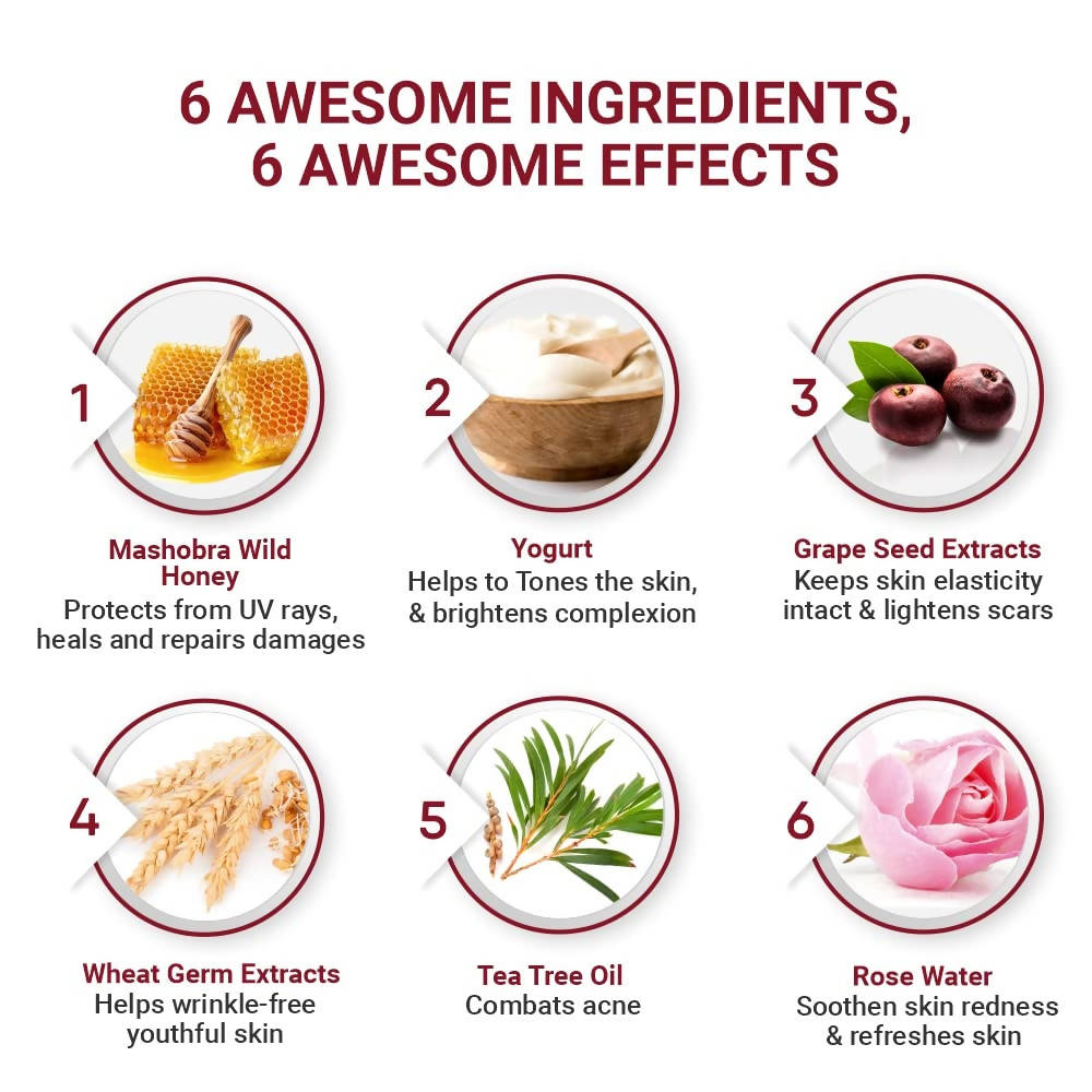 • The gel is formulated with two special ingredients i.e. cow yogurt & wild honey that helps in rejuvenating and removing dead skin cells to make skin youthful and glowing.