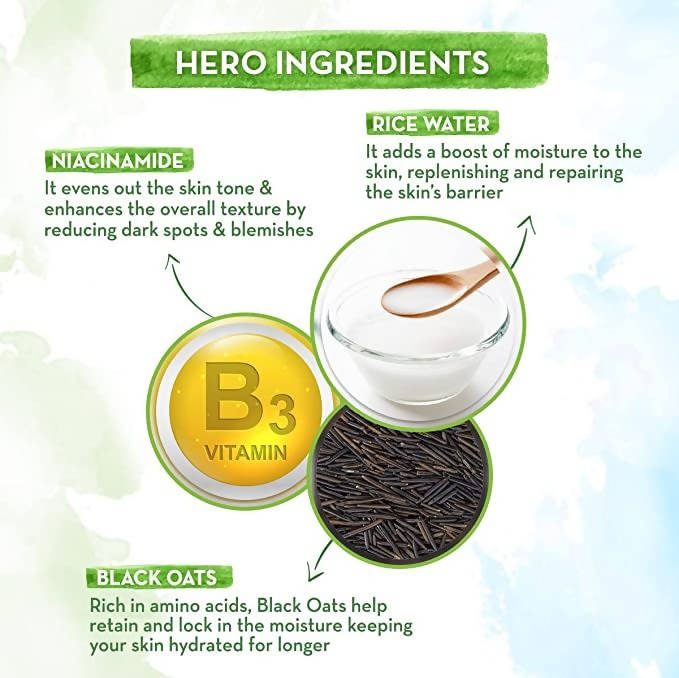Ingredients:- Rice Water, Niacinamide, Black Oats, Soybean Extract