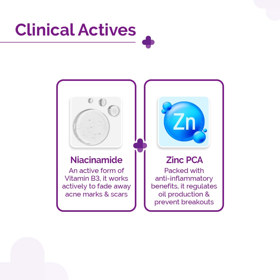 - Fades Acne Marks – Niacinamide is an anti-inflammatory that works to regulate the amount of acne-causing oil being produced by the glands in your skin. In addition, it regulates skin tone and helps fade the red, purple, and brown marks that acne can leave on the skin. Niacinamide improves skin’s barrier, repairs past signs of damage, reduces inflammation, which results in fewer pimples.