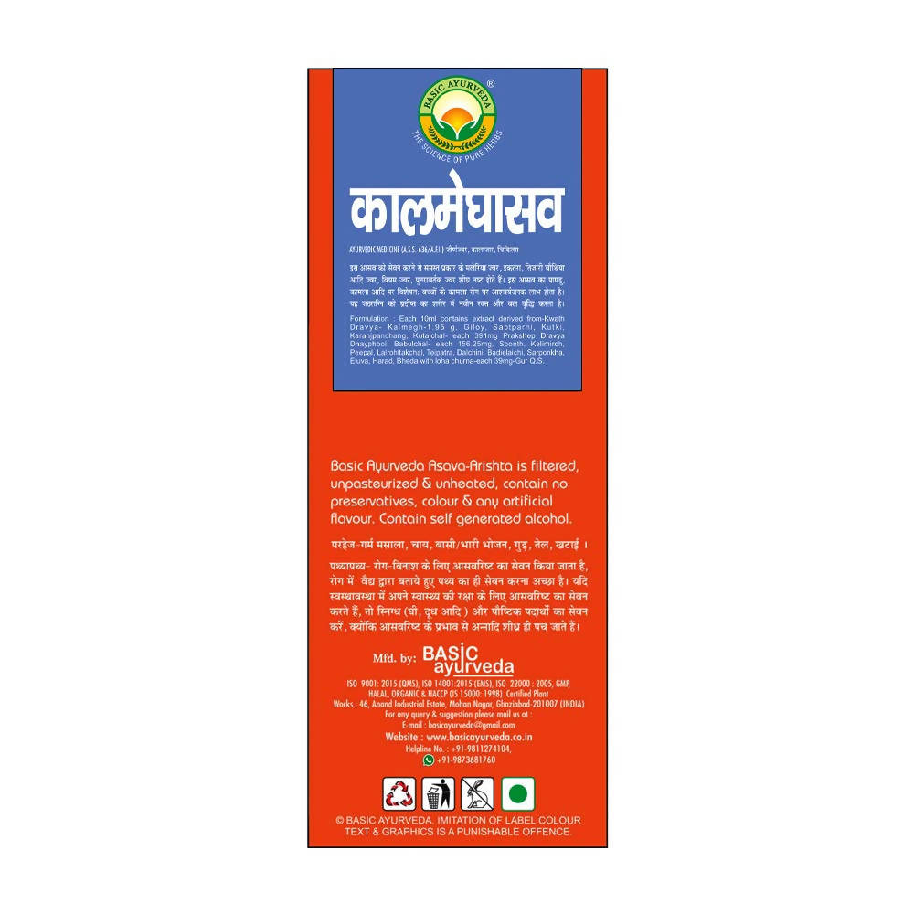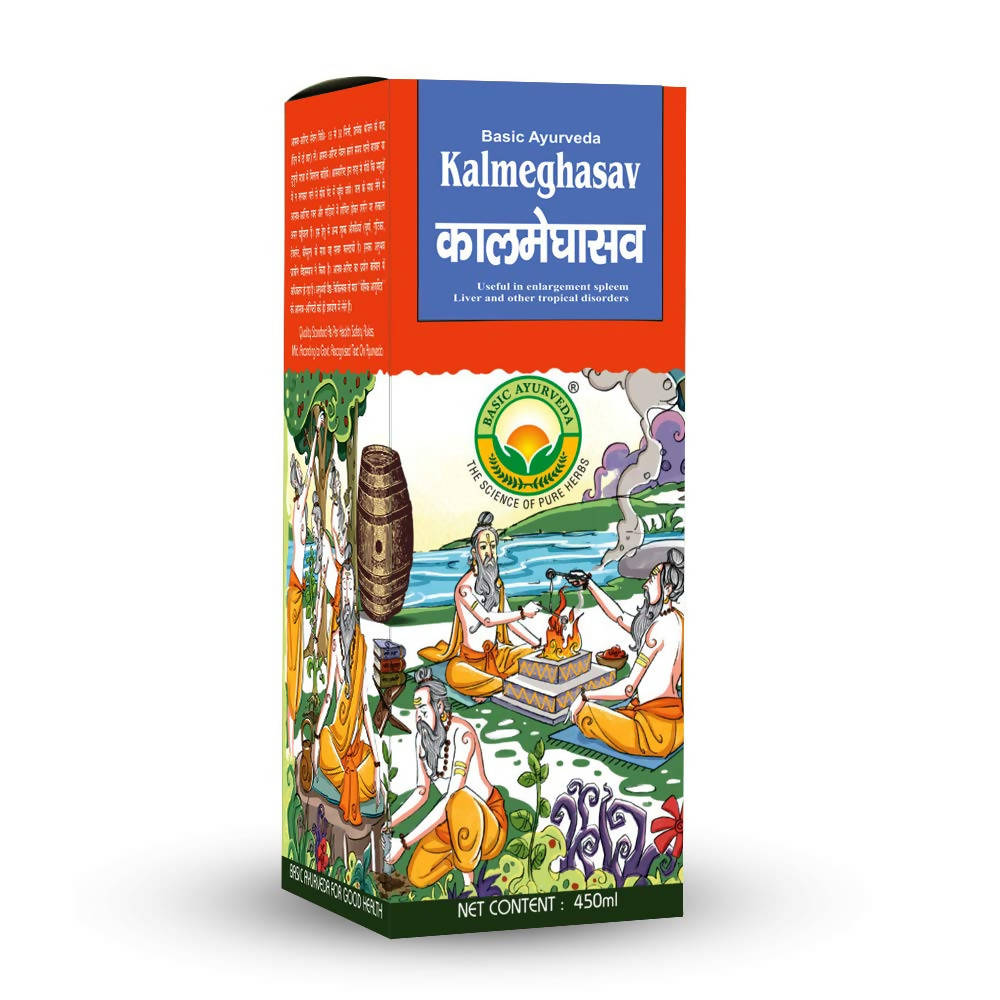 - Basic Ayurveda Kalmeghasav is a liquid Ayurvedic tonic which is a combination of Kalmegh, Guduchi, Saptparni, Kutki, Karang panchang, Kutaj chhal, Dhay Phool , Ginger, Kali mirch, Pippali, lal Rohitak chhal, Tej Patta, Dalchini, Badi Ellaichi, Sarpankha, Eluva, Haritaki, Loh churana, Baheda with other herbs. It is used in the problems of Liver problems, Anti-inflammatory, Antibacterial, Digestive problems, etc.
