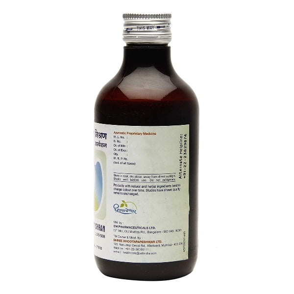 Dhootapapeshwar Amla Pitta Mishran Suspension contains Vasa 100 mg, Guduchi 100 mg, Pittapapada 100 mg, Nimba 100 mg, Chiraita 100 mg, Bhrungaraj 100 mg, Triphala 100 mg, Patol 100 mg, Yashtimadhu 100 mg, Shouktik Bhasma 500mg as active ingredients.