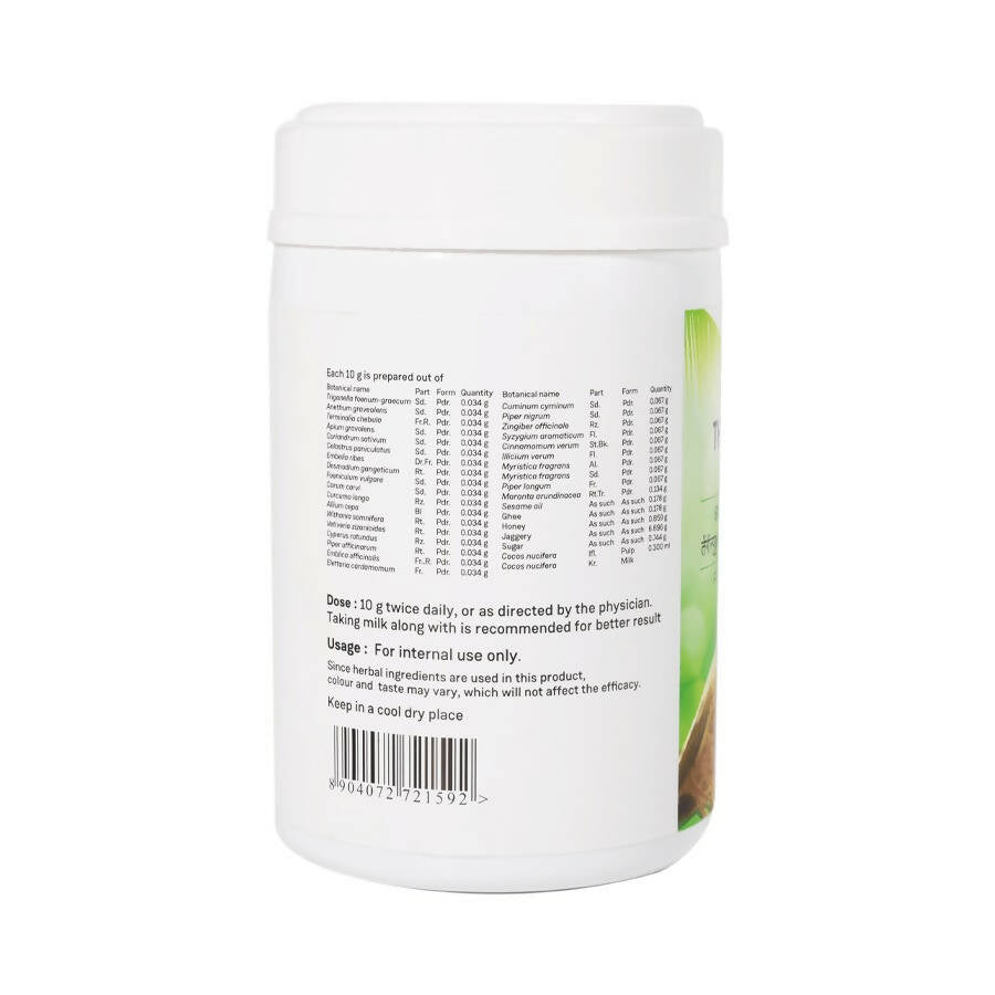 - Adult: 10-15 gms of Thengin Pookkula lehyam on empty stomach in the early evening, followed by half a glass of warm water for best results. or as suggested by the expert.