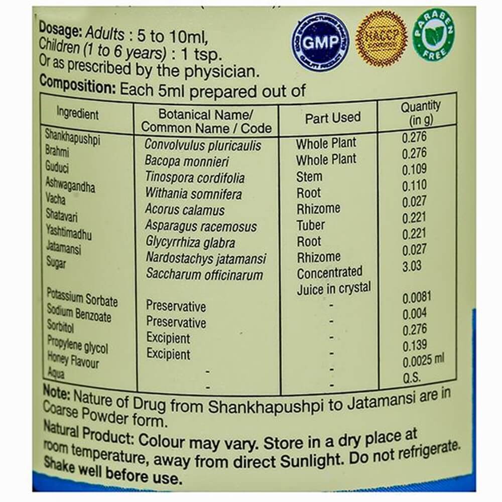 The recommended dosage of Sri Sri Tattva Medhya Rasayana for Adults is 5 to 10 ml and for Children (1 to 6 years)1 tablespoon two times a day.