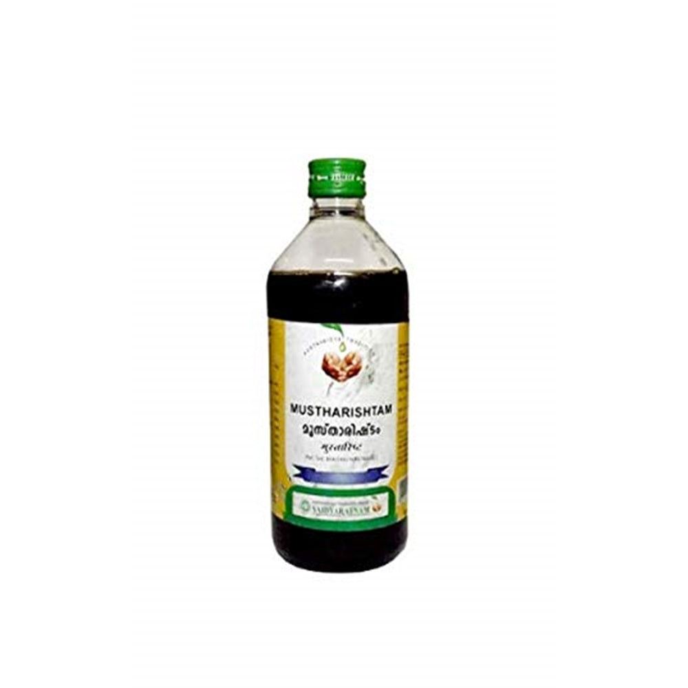 Vaidyaratnam Mustharishtam is an Ayurvedic formulation. This herbal decoction is also called Mustakarishta, Mustarishta, and Mustarishtam. This herbal decoction may be used to get some relief from indigestion.