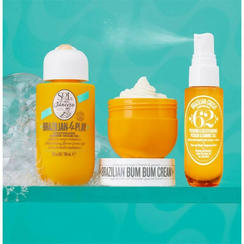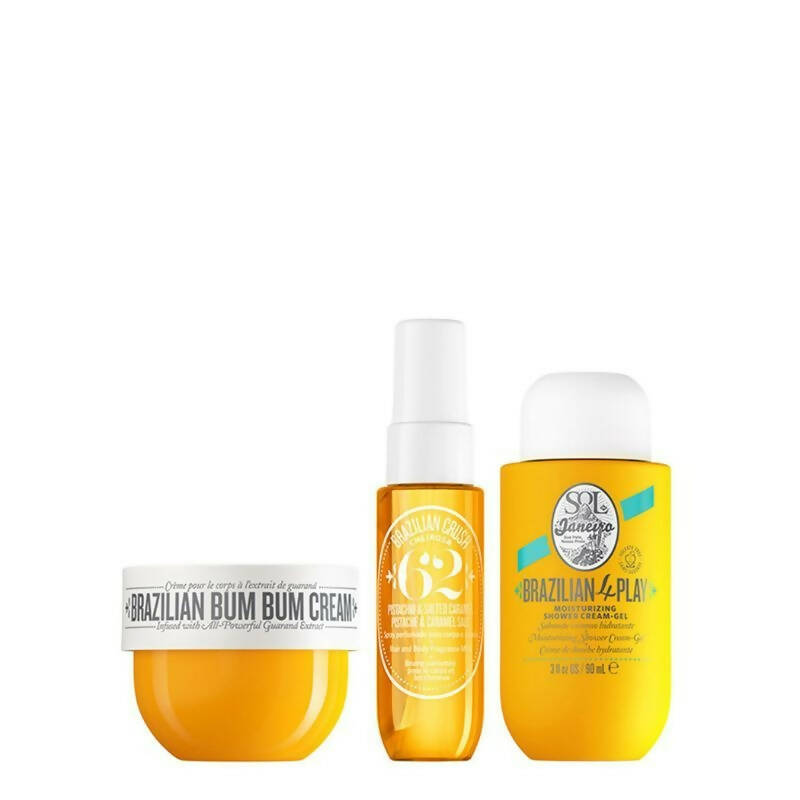 About the Product:These best-loved, travel-friendly minis include the iconic Brazilian Bum Bum Cream, Brazilian 4 Play Shower Cream-Gel, and Brazilian Crush Body Fragrance Mist for a head-to-toe fragrance blended with addictive notes of pistachio and salted caramel. This set helps keep you bodylicious, irresistible, and all set to fly. Bum Bum lovers know that layering this trio results in addictively soft-feeling skin and an even more irresistible fragrance. Experience the cult-fave scent from head-to-toe. Vegan, cruelty-free, sustainably sourced, recyclable packaging.